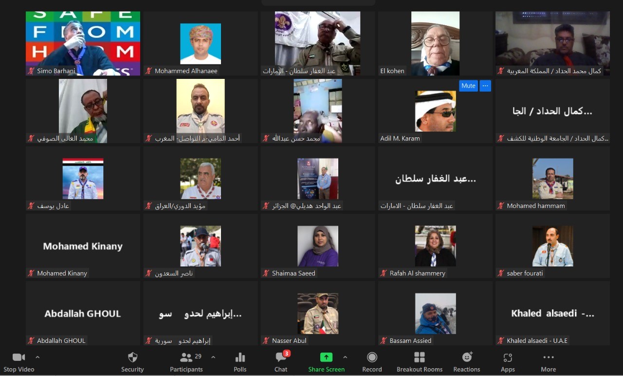 عقدت اللجنة الكشفية العربية المتخصصة لوضع ضوابط التنظيم والمشاركة، وقوائم الكفاءات وعناوين الموضوعات، والبطاقات الفنية لموضوعات الدراسات الثلاث للشارة الخشبية، اجتماعها السابع (عبر الاتصال المرئي) بحضور نائب مدير الإقليم الكشفي العربي مدير إدارة الطرق التربوية بالإقليم رفعت السباعي، ورئيس اللجنة الكشفية العربية الفرعية لتنمية القيادات محمد الهنائي بمشاركة 26 قائداً كشفياً وقائدة يمثلون 14 جمعية كشفية عربية.