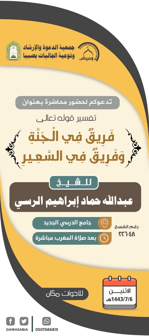ضمن سلسلة جهود جمعية الدعوة والإرشاد وتوعوية الجاليات بمحافظة صبيا تقام محاضرة توعوية مساء اليوم الإثنين ٦ رجب ١٤٤٣هـ الموافق ٧ فبراير ٢٠٢٢م بعد صلاة المغرب في جامع الدرسي الجديد بطريق الملك فهد.