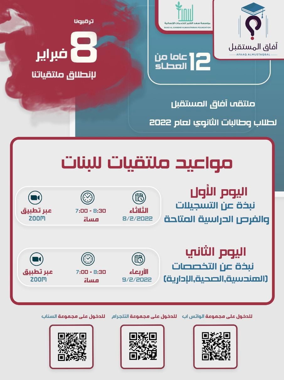 نظمت وحدة آفاق المستقبل بمؤسسة سعد القنبر للخدمات الإنسانية مساء أمس الأحد، افتراضياً، "ملتقى آفاق المستقبل"، بالتعاون مع فريق آفاق المستقبل التطوعي، بهدف مساعد طلاب الجامعات ومرحلة الثانوية في اختيار تخصصاتهم بما يناسب ميولهم.