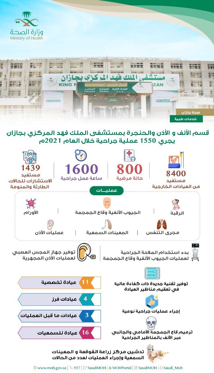 قالت الصحة في جازان بأن 8400 مستفيد تلقوا الخدمات الصحية بعيادات الأنف والأذن والحنجرة بمستشفى الملك فهد المركزي بجازان ، فيما أجريت 1550 عملية جراحية لعدد 800 مستفيد خلال العام الميلادي الماضي 2021م.