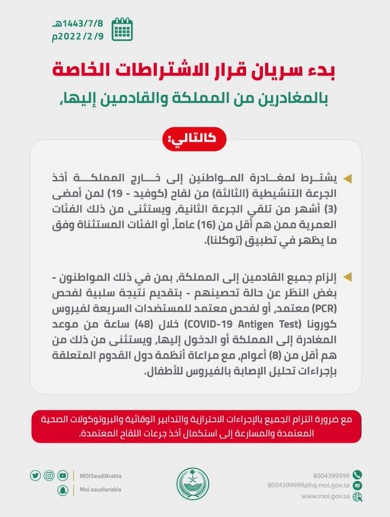 كما تضمن القرار إلزام جميع القادمين إلى المملكة، بمن في ذلك المواطنون؛ بغض النظر عن حالة تحصينهم، بتقديم نتيجة سلبية لفحص "PCR" معتمد أو لفحص معتمد للمستضدات السريعة لفيروس كورونا خلال 48 ساعة من موعد المغادرة أو الدخول إليها.
