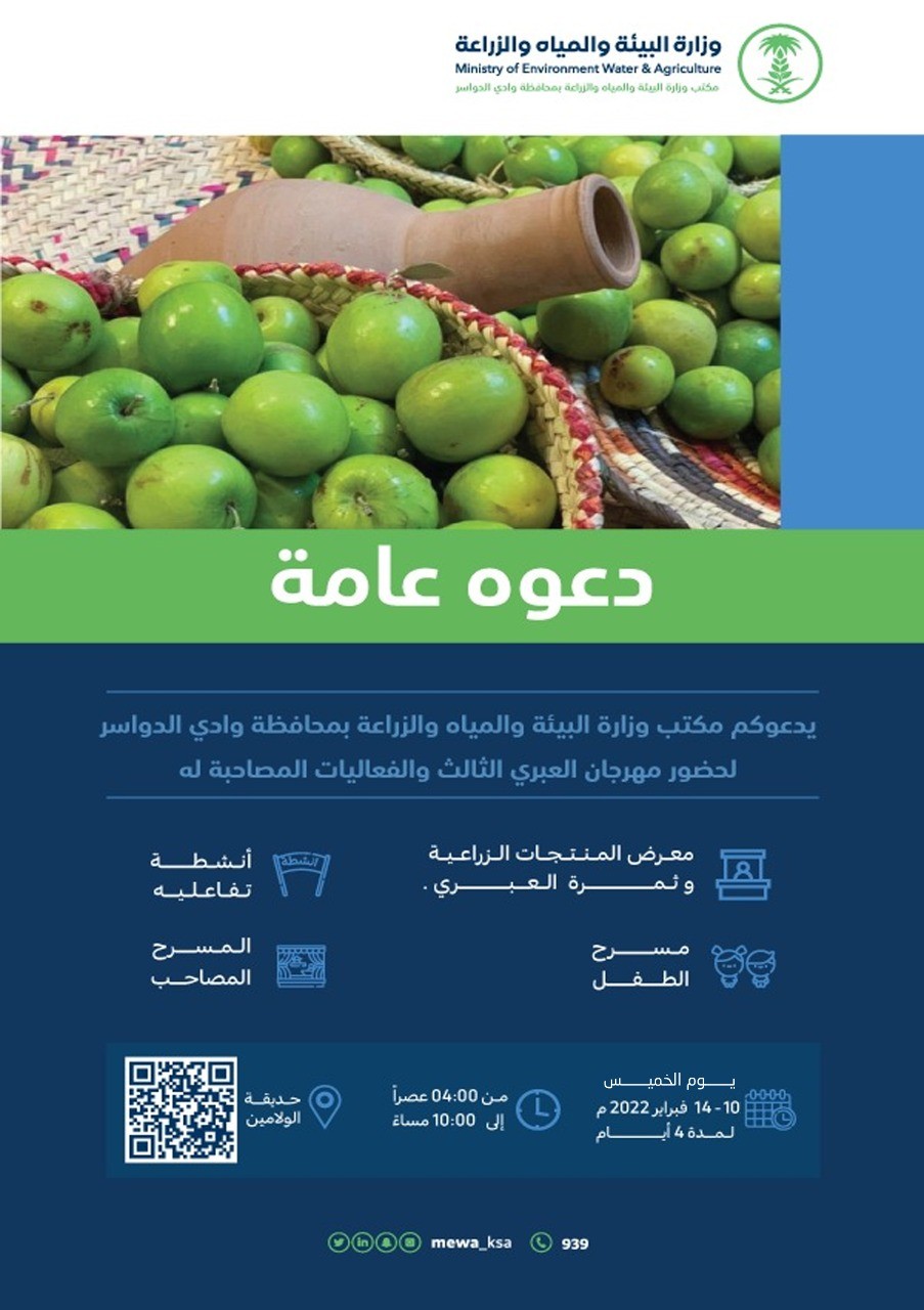 وأوضح مُدير مكتب وزارة البيئة والمياه والزراعة بالمحافظة سهل بن سعد آل بوسباع أن المهرجان الذي سيحضر حفل افتتاحه مُدير عام فرع وزارة البيئة والمياه والزراعة بمنطقة الرياض الدكتور ماجد بن عبدالعزيز الفراج، يتضمن روزنامة من الفعاليات المتنوعة تشمل معرضاً للمنتوجات الزراعية بوادي الدواسر، ومسرحاً للطفل، وفقرات ترفيهية ستقام طيلة فترة المهرجان ولجميع شرائح المجتمع، داعياً أهالي المحافظة إلى زيارة المهرجان والاستمتاع بالبرامج الترفيهية والفعاليات المقامة.