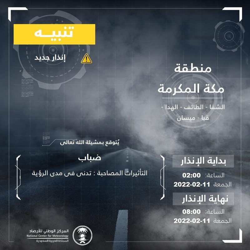 وتشهد منطقة مكة المكرمة ضبابًا مع تدنٍ في مدى الرؤية الأفقية ، وتشمل الحالة الشفا والطائف والهدا وقيا وميسان، وتستمر حتى الساعة الـ 08.00 من صباح الجمعة.