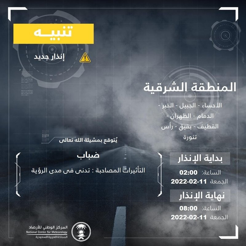 وتشهد المنطقة الشرقية ضبابًا مع تدنٍ في مدى الرؤية الأفقية، وتشمل الحالة الأحساء والجبيل والخبر والدمام والقطيف والظهران وبقيق ورأس تنورة، فيما تشهد المنطقة رياحًا نشطة وسحبًا رعدية على الخفجي والقيصومة والنعيرية وحفر الباطن وقرية العليا، وتستمر الحالات حتى الساعة الـ 08.00 من صباح الجمعة.