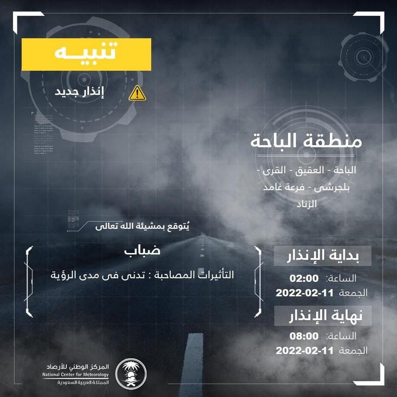 ونبه المركز منطقة الباحة بأنها تشهد ضبابًا مع تدنٍ في مدى الرؤية الأفقية، وتشمل الحالة الباحة والعقيق والقرى وبلجرشي وفرعة غامد الزناد، وتستمر حتى الساعة الـ 08.00 من صباح الجمعة.