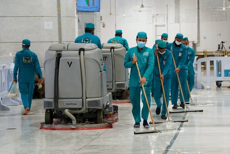 وأفاد أنه يتم بعد ذلك استخدم الآليات والتقنيات الحديثة التي وفرتها الرئاسة العامة وهي آليات تقوم بالتغسيل والتشطيف والشفط، ثم يرش السطح بالماء مرة أخرى ويمسح، وبعدها مرحلة التجفيف وفي النهاية يرش ماء الورد الطبيعي. وتنجز عملية التنظيف عادة في مدة زمنية لا تتجاوز (٢٠) دقيقة، من خلال متخصصين ومدربين لخدمة البيت الحرام وقاصديه.