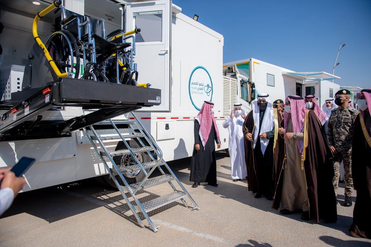 واستمع سمو أمير القصيم إلى شرح موجز من الرئيس التنفيذي لتجمع القصيم الصحي، عن الخدمات الاستشارية التي تقدمها العيادات المتنقلة التي تشمل مجموعة من العربات الكبيرة والمتوسطة الحجم، وتضم عيادات طب الأسرة، ورعاية الأمومة، والطفل السليم، والتطعيمات، ومكافحة الأمراض المعدية، والتوعية الصحية، وطب الأسنان، وخدمات المختبر، وخدمات الأشعة.