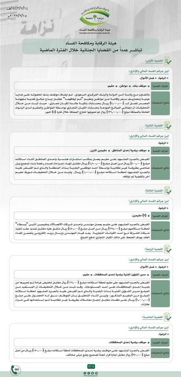 وكانت أبرز القضايا على النحو الآتي: القضية الأولى: بالتعاون مع رئاسة أمن الدولة والبنك المركزي السعودي، تم إيقاف موظف بنك لحصوله على هدايا عينية ومصاريف سفر وإقامة من مواطن ومقيم "تم إيقافهما" مقابل إيداع مبالغ نقدية مجهولة المصدر تصل لـ (7.000.000) سبعة ملايين ريال بحسابات بنكية عائدة لكيان تجاري، حيث ثبت من خلال التحقيقات أن إجمالي المبالغ المودعة بحسابات الكيان التجاري بواسطة المواطن والمقيم لدى البنوك العاملة بالمملكة بلغ (136.000.000) مائة وستة وثلاثون مليون ريال تم تحويلها لخارج المملكة خلال فترة (5) أشهر.