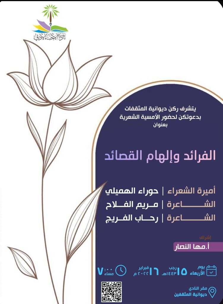 شارك في الأمسية شاعرات الأحساء: مريم الفلاح، حوراء الهميلي، رحاب الفريج،  وأدارتها مها النصار الدوسري بديوانية المثقفات بمقر النادي بحضور مجموعة من مثقفات الأحساء.