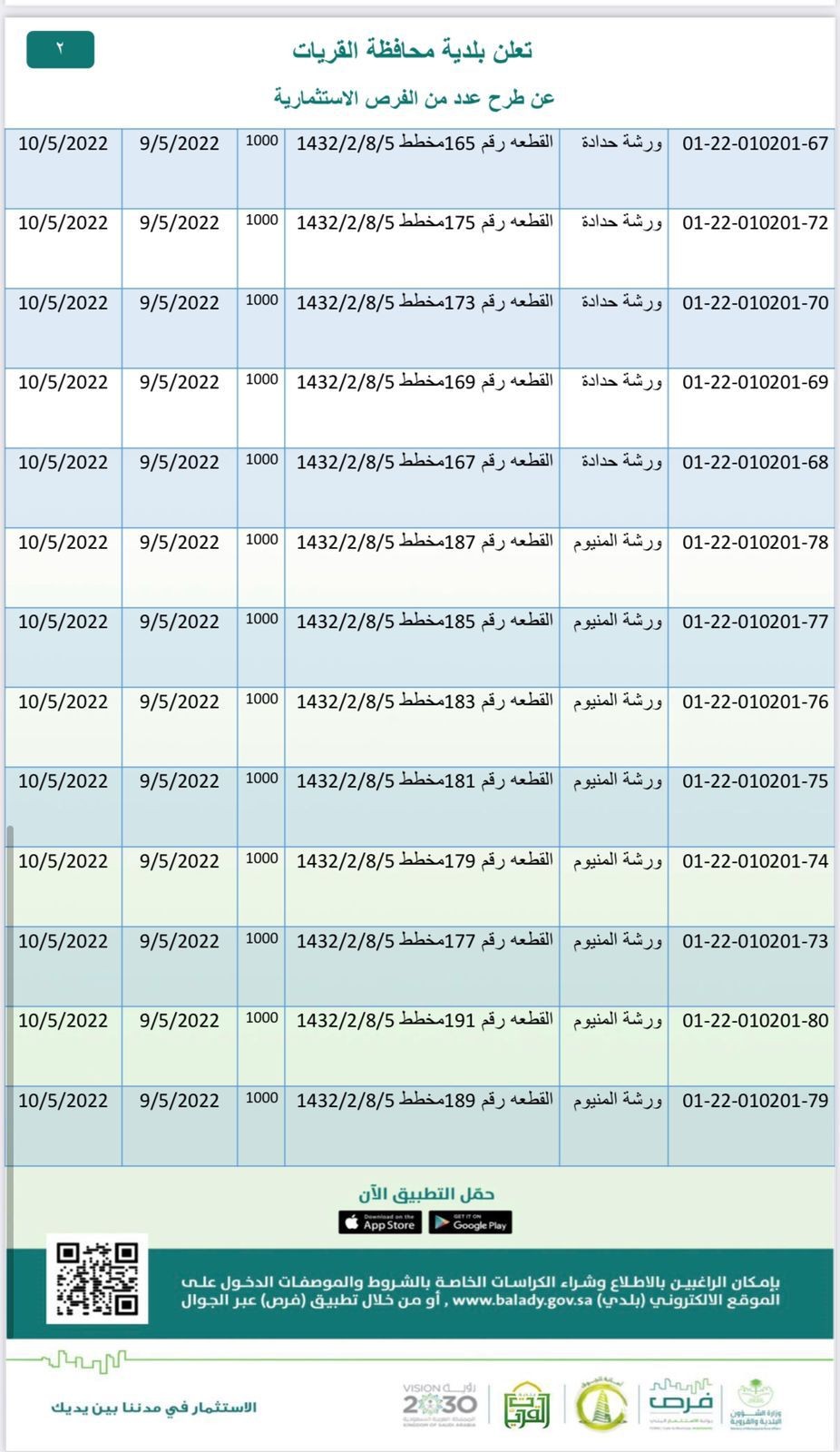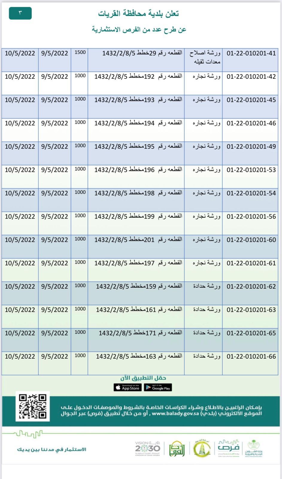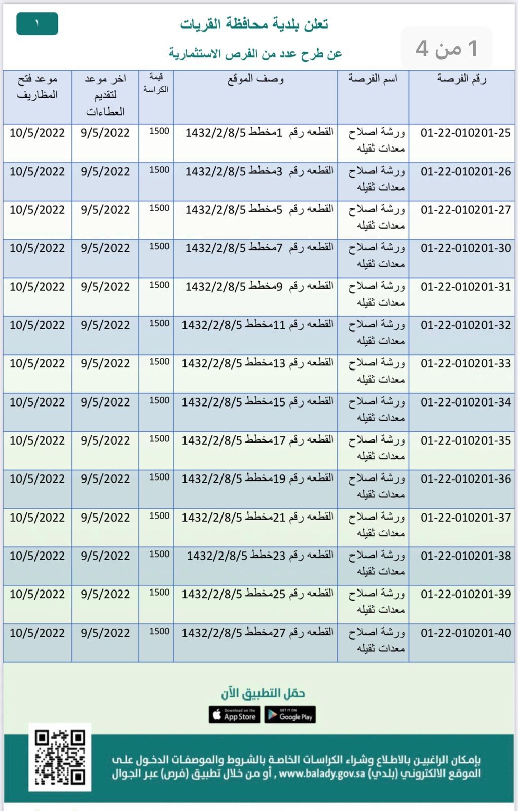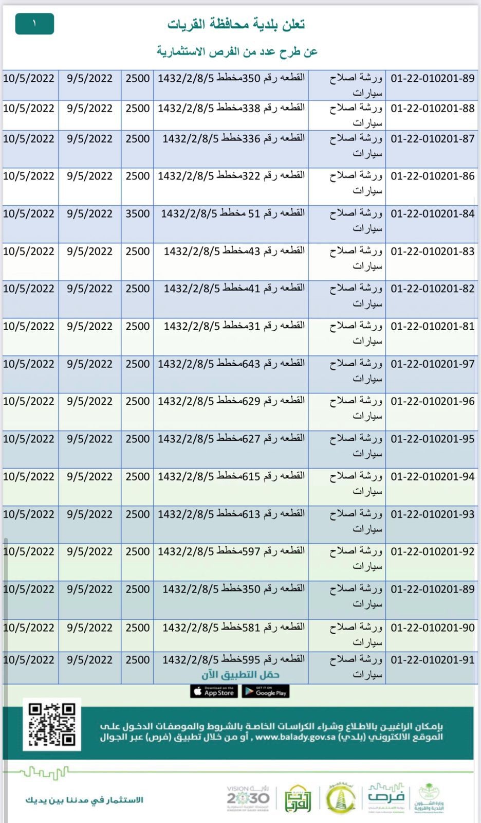 طرحت بلدية محافظة القريات من الفرص الاستثمارية لعام 2022م, التي بلغت (58 ) فرصة عبر منصة فرص.