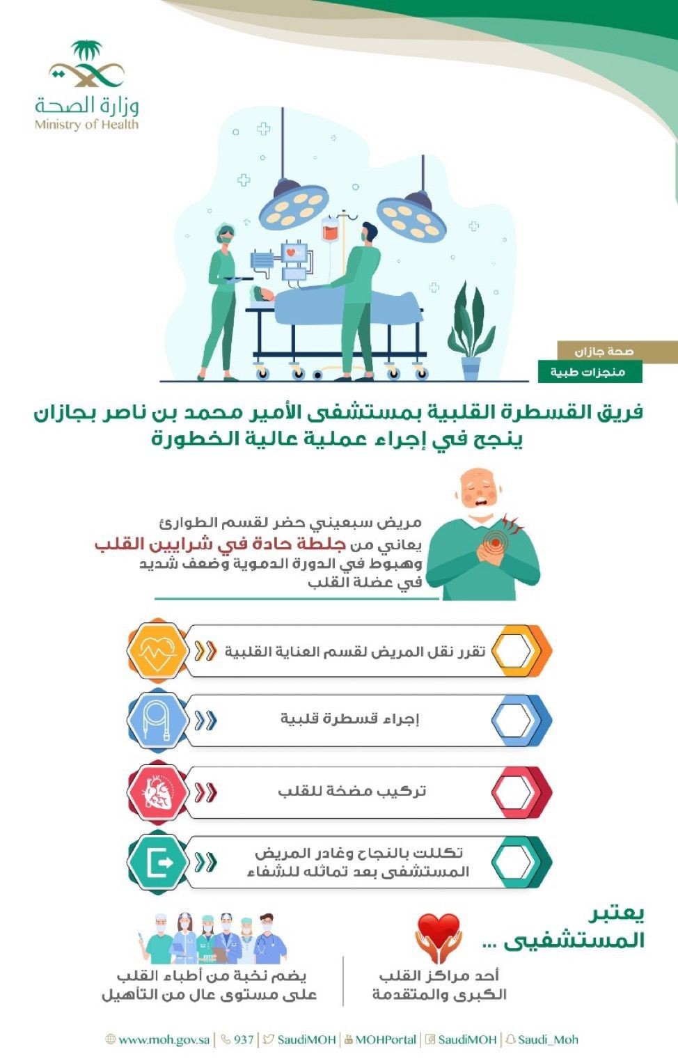 وفي التفاصيل ذكرت صحة جازان بأن المريض حضر لقسم الطوارئ وكان يعاني من جلطة حادة في شرايين القلب وهبوط في الدورة الدموية وضعف شديد في عضلة القلب.