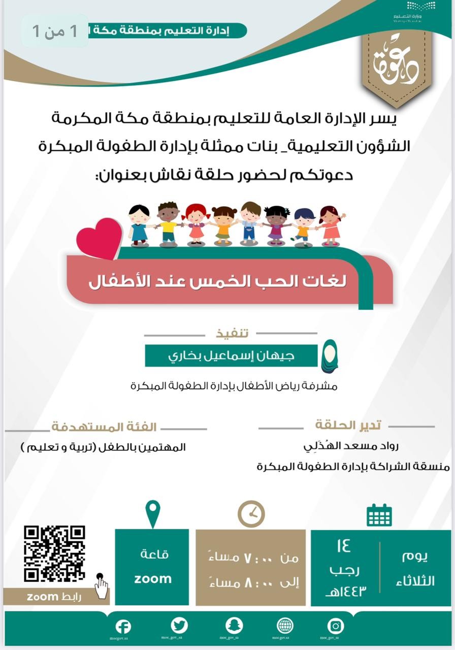 نفذت الإدارة العامة للتعليم بمنطقة مكة المكرمة ممثلةً بإدارة الطفولة المبكرة يوم الثلاثاء الموافق 14 / 7 /1443هـ، حلقةً تنشيطيةً بعنوان (لغات الحب الخمس عند الأطفال) نفذهُ مشرفة رياض الأطفال جيهان إسماعيل بخاري بمساندة وحدة ارتقاء تحت إشراف مديرة الإدارة زكية الصبحي.