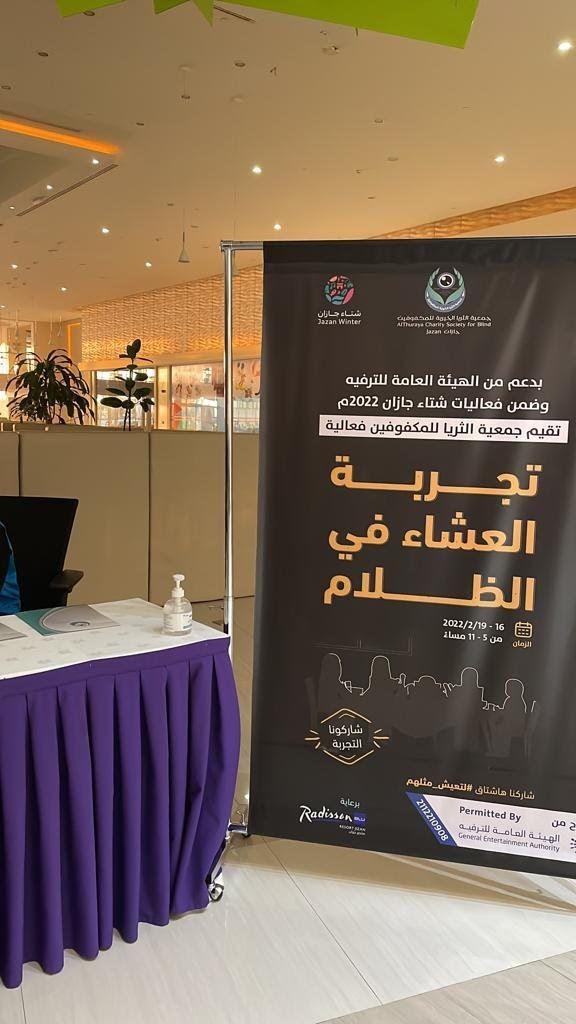 بدعم من هيئة الترفيه وضمن فعاليات مهرجان شتاء جازان اقامت جمعية الثريا الأهلية للمكفوفين في منطقة جازان فعالية العشاء في الظلام حيث إن زوار الفعالية يتناولون العشاء في غرفة مظلمة لكي يعيشو تجربة الشخص الكفيف في حياته اليومية. وما يميز هذه الفعالية كذلك أن من يقوم على خدمة الزوار هم المكفوفون أنفسهم ، حيث تقام الفعالية على مدى ٤ أيام من الأربعاء الموافق ٢/١٦ وحتى يوم السبت ٢/١٩ في منتجع ريدسون بلو الجدير بالذكر أن الفعالية تقام لأول مرة على مستوى المنطقة الجنوبية وقد حظيت الفعالية في اليومين الماضين من حين انطلاقتها بإقبال كبير من الزوار.