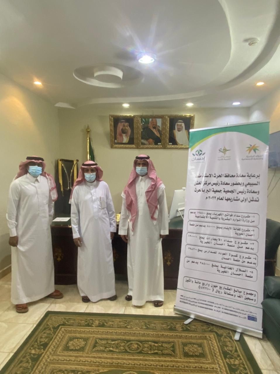 دشن محافظ الحرث الأستاذ مقعد السبيعي في مكتبه اليوم، العديد من مشاريع جمعية البر الخيرية في محافظة الحرث بحضور رئيس مجلس إدارة جمعية البر الخيرية الأستاذ أحمد هزازي واستمع إلى شرح مفصل عن المشاريع من قبل المدير التنفيذي لجمعية البر الاستاذ خالد مدخلي وتضمنت المشاريع مشروع سداد فواتير الكهرباء بمبلغ وقدره 194400 ريال ومشروع كفالة الأيتام بمبلغ وقدره 480000 ريال ومشروع سداد الإيجارات بمبلغ وقدره 120000 ريال.