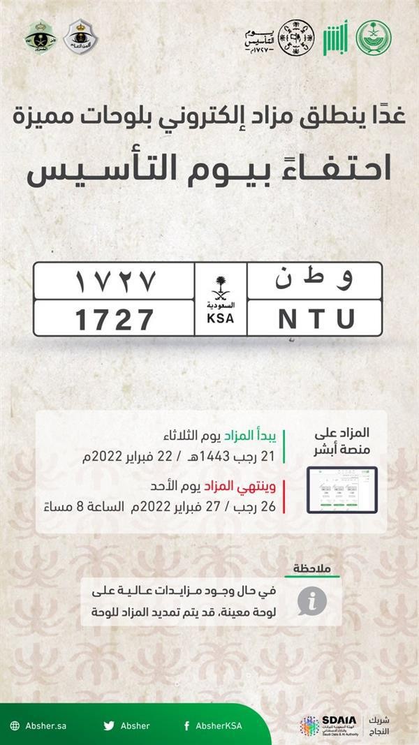 أعلنت الإدارة العامة للمرور طرح مزاد اللوحات الإلكتروني الاستثنائي غدًا (الثلاثاء) عبر منصة "أبشر"، احتفاءً بيوم التأسيس، ويستمر حتى يوم الأحد المقبل.