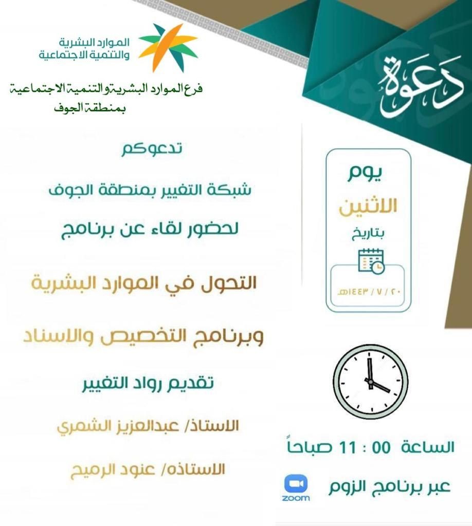 بتوجيه من سعادة مدير عام فرع وزارة الموارد البشرية والتنمية الاجتماعية بمنطقة الجوف سعادة الاستاذ/ نايل بن عبدالعزيز الرويلي (راعي التغيير) اقامت شبكة التغيير بفرع منطقة الجوف اللقاء التعريفي والتثقيفي لمنصة يامر عن بعد عبر منصة زووم