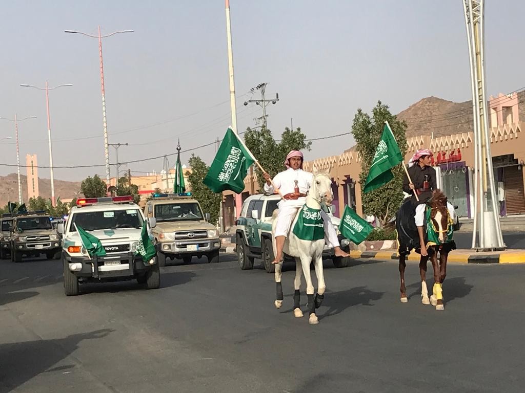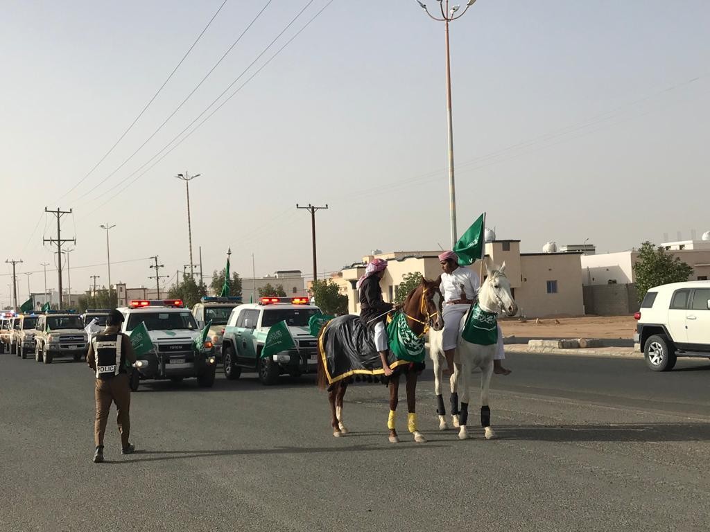 حيث انطلقت المسيرة من مبنى الإمارة مرورًا بالأحياء ومداخل المحافظة، وتقدم المسيرة المحافظ المكلف الأستاذ أحمد بن عبدالله الخالدي وبمشاركة الإدارات الحكومية المدنية والعسكرية والمواطنين ، وعدد من الخيالة.