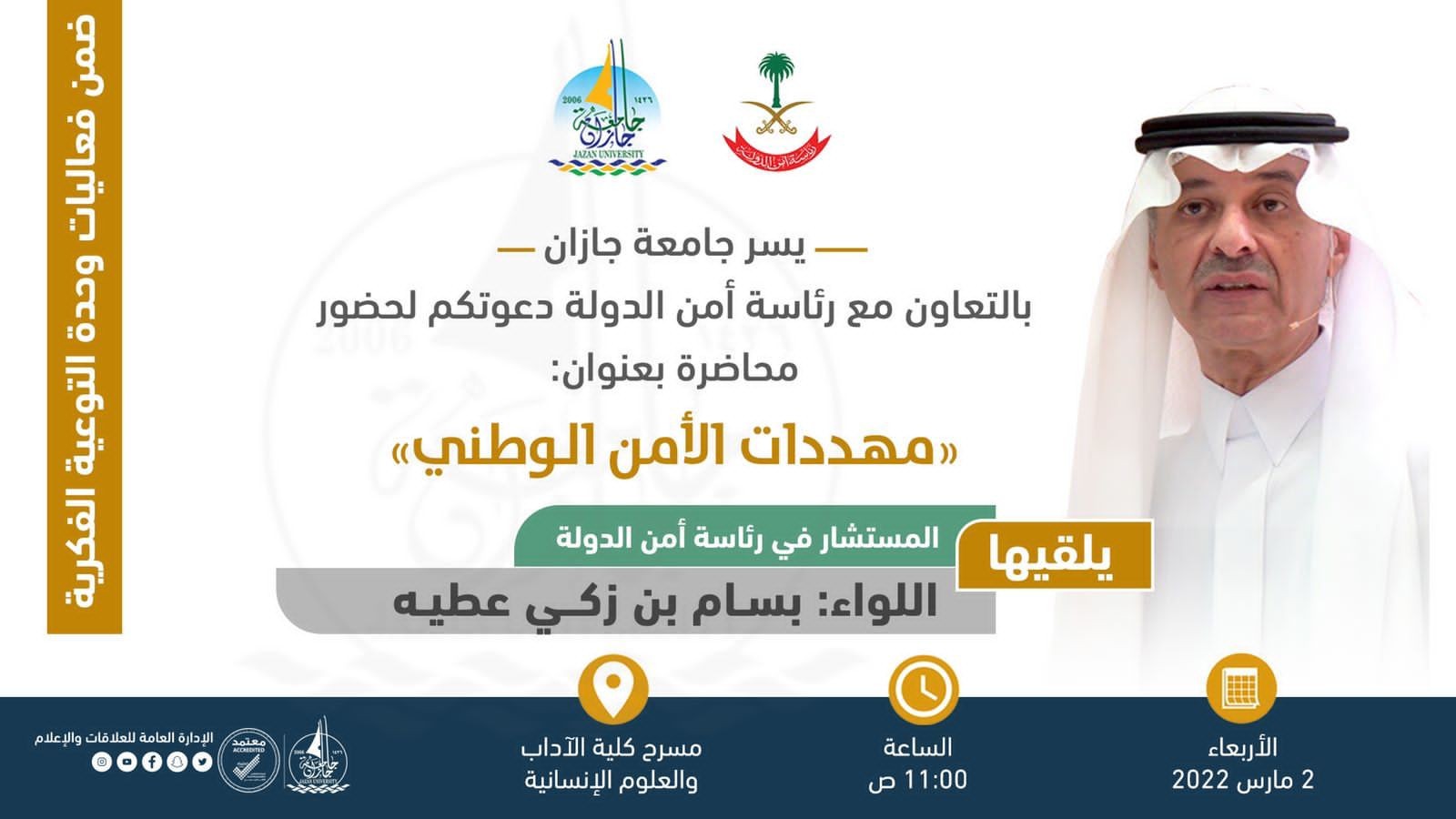 تنظم جامعة جازان صباح الأربعاء المقبل تحت رعاية معالي رئيس الجامعة الأستاذ الدكتور مرعي بن حسين القحطاني محاضرة بعنوان "مهددات الأمن الوطني" يلقيها المستشار في رئاسة أمن الدولة اللواء بسام بن زكي عطيه على مسرح كلية الآداب والعلوم الإنسانية.