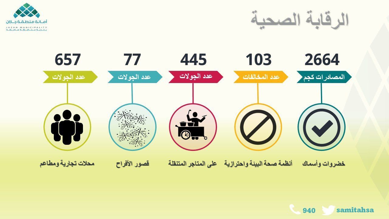 نفّذت أمانة منطقة جازان ممثلة ببلدية محافظة صامطة خلال شهر فبراير الماضي، 1179 جولة رقابية على المحال التجارية، والمنشآت الغذائية والمطاعم والمتاجر المتنقلة وقصور الأفراح، للتأكّد من تطبيق الاشتراطات الصحية والبلدية على جميع المحال التجارية والغذائية والتزامهم بالاشتراطات الصحية.