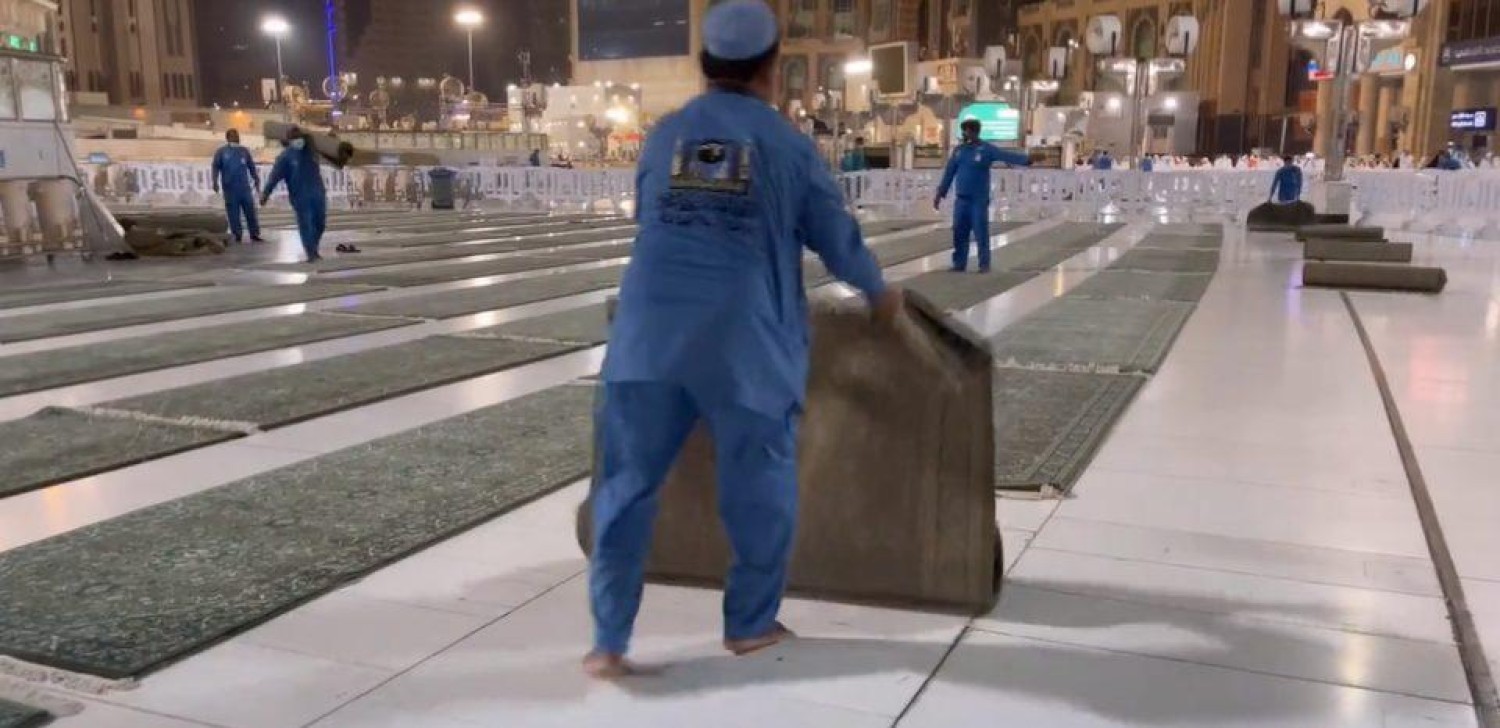 ونشرت قناة “الإخبارية” فيديو يوثق لقطات العمال وهم يحملون السجاد ويقومون بإعادة وضعه على الأرض في الساحات الخارجية للمسجد.