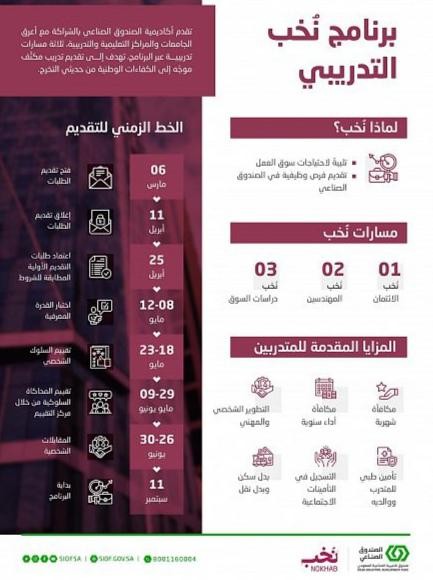 ودعا صندوق التنمية الصناعية السعودي حديثي التخرج من مرحلتَي البكالوريوس والماجستير إلى التقدُّم لبرنامج “نُخب” التدريبي عبر موقعه الإلكتروني، موضحاً في ذات السياق بأن التقديم متاح حتى 11 أبريل 2022م، وانطلاق التدريب في 11 سبتمبر 2022م.