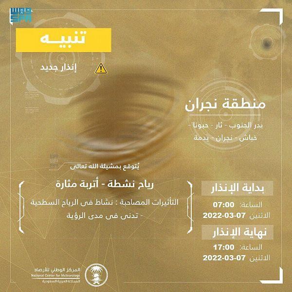 الأرصاد": رياح نشطة وأتربة مثارة على منطقة نجران