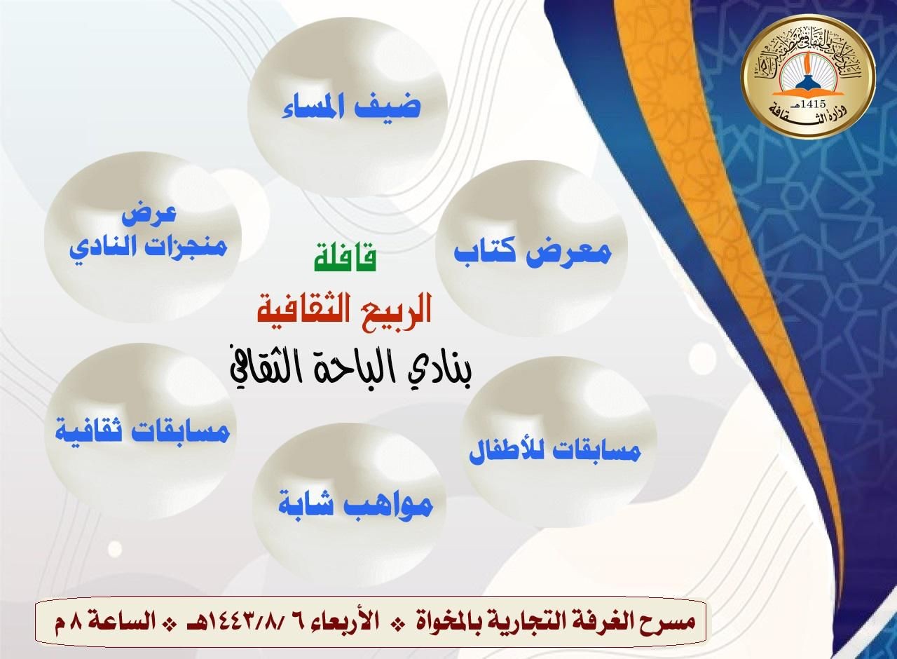 تحط (قافلة الربيع الثقافية بنادي الباحة الأدبي الثقافي)  في (مسرح الغرفة التجارية بالمخواة) يوم الأربعاء 6-8-1432هـ الموافق 9 /3 /2022م ويأتي هذا النشاط في إطار الشراكة المجتمعية بين النادي مع الجهات ذات العلاقة وسيبدأ المساء بعرض مرئي عن منجزات النادي ثم لقاء مع الأديب القاص والاعلامي الأستاذ ناصر العمري سيتحدث من خلاله عن تجربته ويقرأ بعض إبداعاته بعدها يفتح المجال للمشاركات الشعرية والسردية والفنية والمواهب الشابة كما سيتخلل الفقرات مسابقات ثقافية لجميع الأعمار اضافة إلى معرض الكتاب المتنقل.