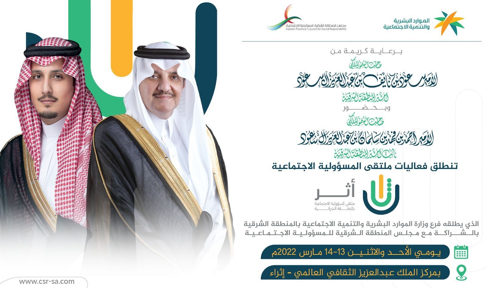 تحت رعاية صاحب السمو الملكي الأمير سعود بن نايف بن عبدالعزيز أمير المنطقة الشرقية وبحضور وتشريف صاحب السمو الملكي الأمير أحمد بن فهد بن سلمان نائب أمير المنطقة الشرقية، يطلق فرع وزارة الموارد البشرية والتنمية الاجتماعية الأحد القادم ملتقى المسؤولية الاجتماعية بالشراكة مع مجلس المنطقة الشرقية للمسؤولية الاجتماعية تحت شعار "أثر" بحضور وكيل وزارة الموارد البشرية والتنمية الاجتماعية لتنمية المجتمع الأستاذ أحمد بن صالح الماجد، ويقام الملتقى في مركز الملك عبدالعزيز الثقافي العالمي "إثراء" لمدة يومين .