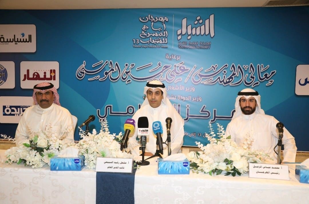 وقال السبيعي خلال المؤتمر الصحافي الذي عُقد في مسرح الدسمة أول من أمس، بحضور كلاً من رئيس المهرجان محمد المزعل ورئيس اللجنة الإعلامية الزميل مفرح الشمري: «نعلن اليوم انطلاق فعاليات الدورة 13 لمهرجان أيام المسرح للشباب، تحت رعاية معالي وزير الأشغال العامة ووزير الدولة لشؤون الشباب السيد/ م. علي حسين الموسى، وذلك يوم الأحد الموافق 13 من شهر مارس الجاري، والذي سيستمر خلال الفترة من 13 – 20 مارس - بمسرح الدسمة، وسيتضمن بمشيئة الله (5) عروض مسرحية تتنافس على (13) جائزة، و الجائزة الكبرى هي جائزة الفنان الراحل (خالد النفيسي) رحمه الله، تقديراً لدوره الفني وعطائه خلال مسيرته الفنية الحافلة».
