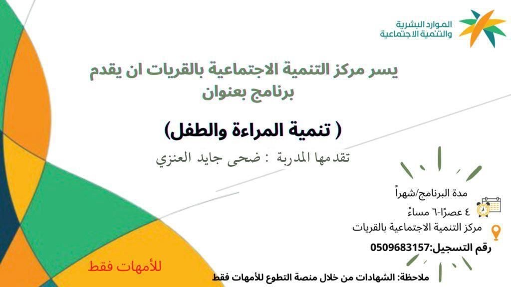 تضمن البرنامج تنمية المراءة وتطويرها من الناحيه النفسيه والجسديه والمعنويه بالاضافه الي معرفة الطريقه الصحيحه لتربية الطفل واللجوء الى الاساليب المقنعه لتوجيه الطفل الى الطريق الصحيح والابتعاد عن العند والاساليب العدوانيه ومقدرة الطفل على تخطي العقبات التي تواجهه من خجل شديد او انطواء وكسر حاجز الخوف عند الطفل وإحتوائه لتقوية شخصيته امام المجتمع ويأتي هذا البرنامج ضمن برامج المركز الموجه للمجتمع المحلي .