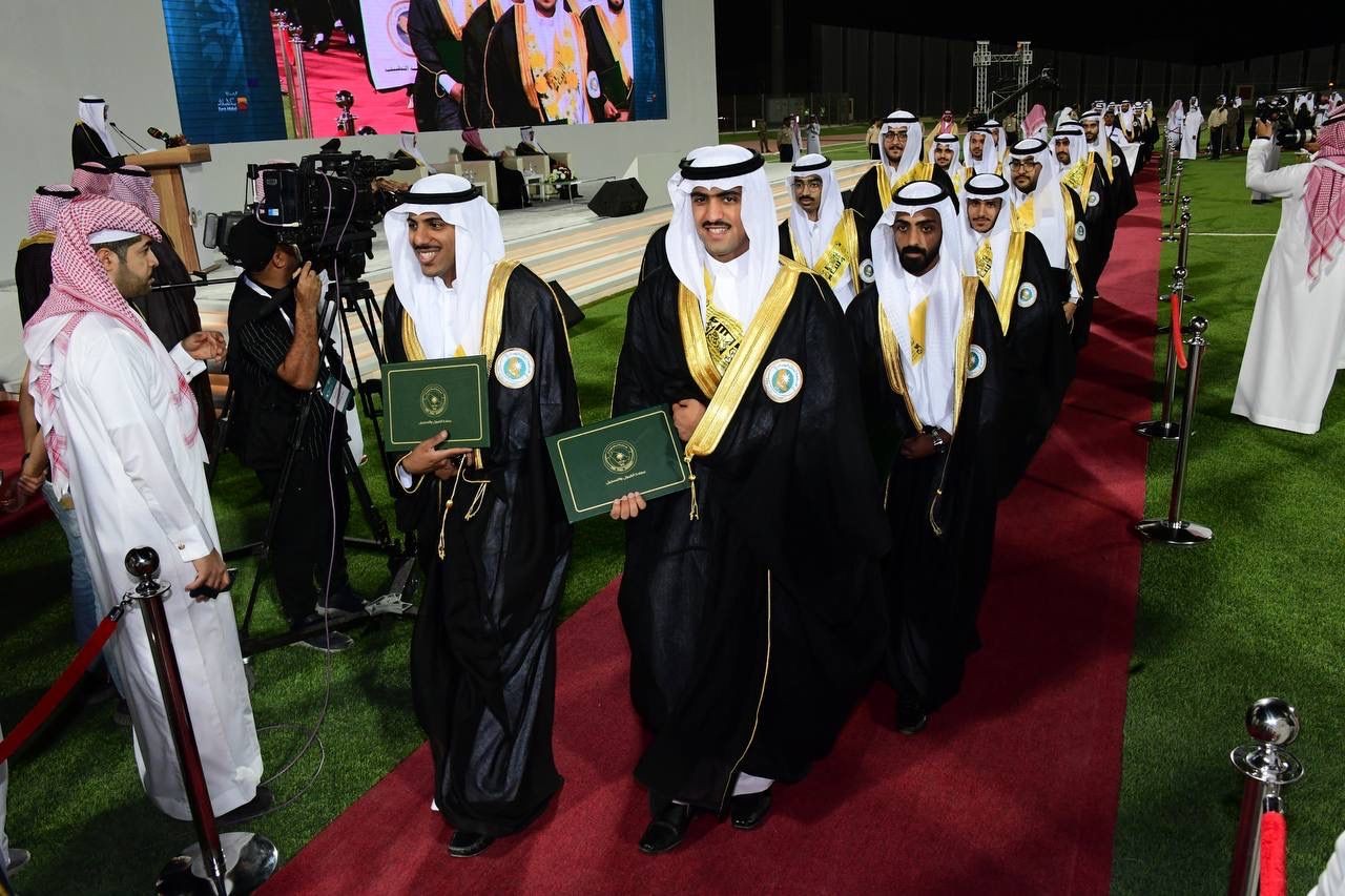 وبدأ الحفل بالسلام الملكي، ثم انطلقت المسيرة الأكاديمية يتقدمهم معالي رئيس الجامعة الدكتور محمد بن عبدالعزيز العوهلي، وأعضاء مجلس الجامعة من وكلاء وعمداء الكليات والعمادات المساندة، وتخلل الحفل أداء القسم، وعرضًا مرئيًّا عن الجامعة.