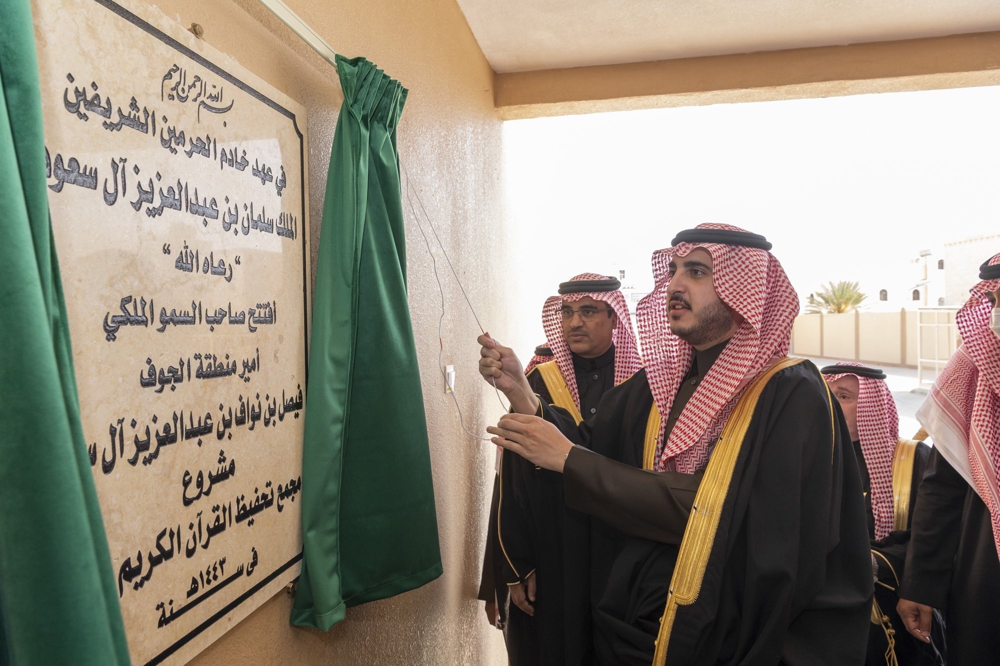 كما دشن سمو أمير المنطقة اليوم ضمن جولاته التفقدية مجمع قارا لتحفيظ القرآن الكريم في مدينة سكاكا, وتجول سموه في المجمع مطلعاً على ما يحتويه, مستمعاً لشرح من القائمين على المشروع عن الطاقة الاستيعابية وعدد الفصول والخدمات المتوفرة بالمجمع.