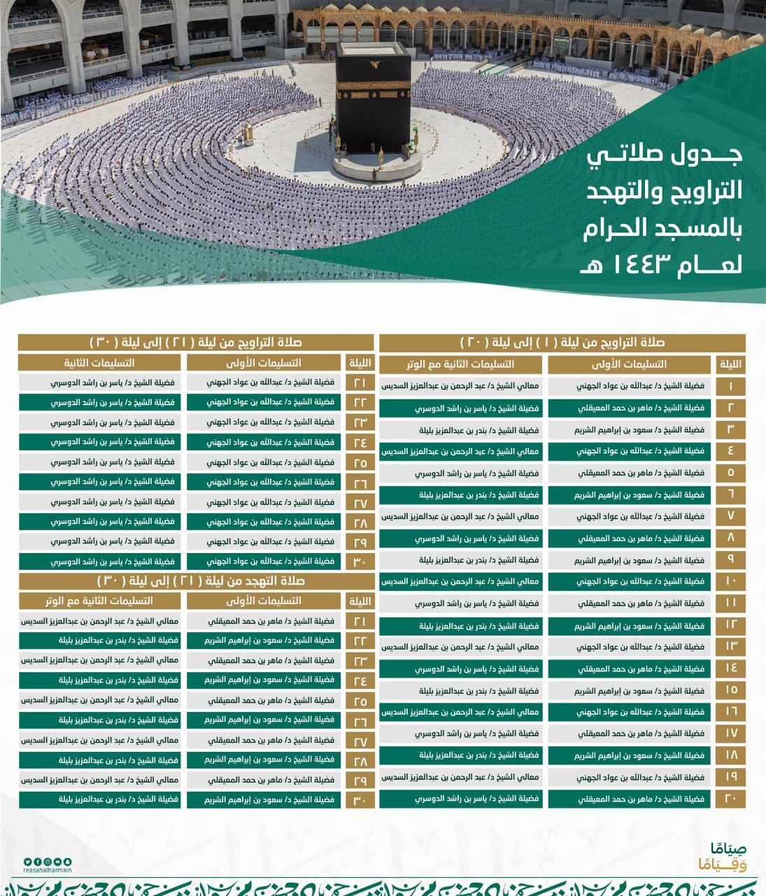 اعتمد معالي الرئيس العام لشؤون الحرمين الشيخ الدكتور عبدالرحمن السديس، جدول صلاتي التراويح والتهجد في المسجد الحرام خلال شهر رمضان المبارك لعام 1443.