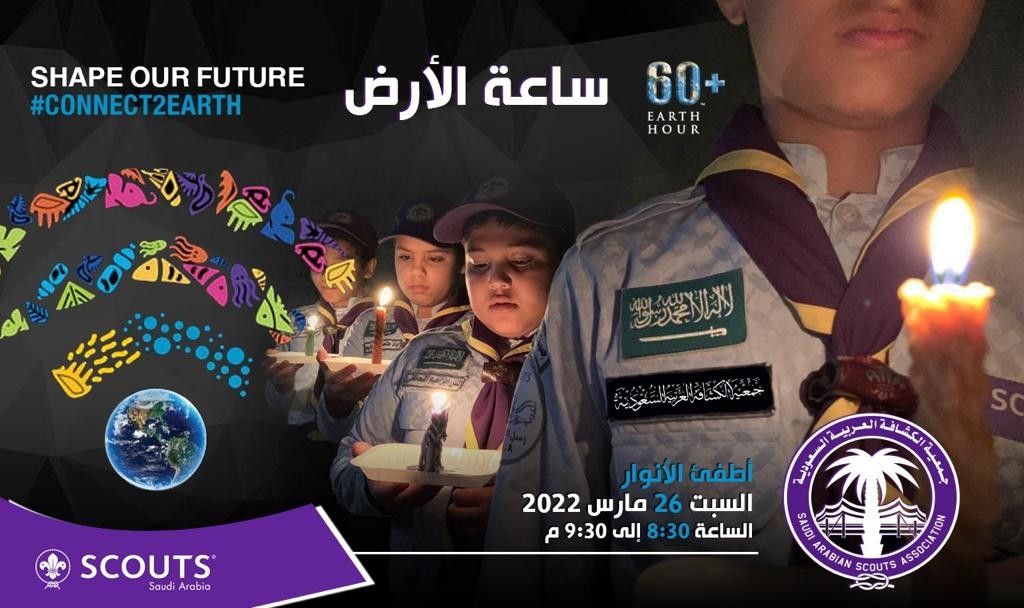 تُشارك جمعية الكشافة العربية السعودية مثيلاتها من الجمعيات الكشفية حول العالم، المشاركة في "ساعة الأرض " والتي تُقام يوم غدٍ السبت الموافق 26 مارس 2021، الساعة 08:30 مساءً.