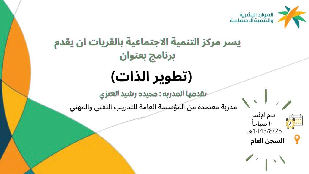 المدربه المعتمد  من المؤسسه العامه للتدريب التقني والمهني صباح يوم الاثنين الساعه العاشره بتاريخ ٢٥/ ٨ / ١٤٤٣ هـ تضمن البرنامج عدة جوانب لعملية تطوير الذات والمهارات في تطوير الذات وتحديد الاهداف  للوصول لتطوير الذات وتحقيق الغايات بالاضافه الي تطوير العلاقات الاجتماعيه والثقه بالنفس والارتقاء بالتفكير وتجنب الطاقات السلبيه وممارسة الانشطه النافعه التي تدفع الانسان الى تطوير ذاته .