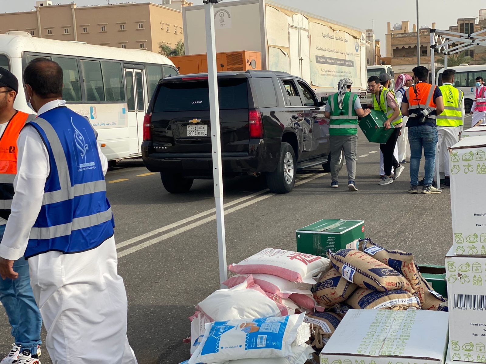 وكان التوزيع بتخطيط وتنظيم لخط السير المروري خارج مقر الجمعية لتوصيل السلال لمركبة المستفيد مباشرة حفاظاً على صحة المستفيدين وفريق العمل ومنعاً للازدحام  .