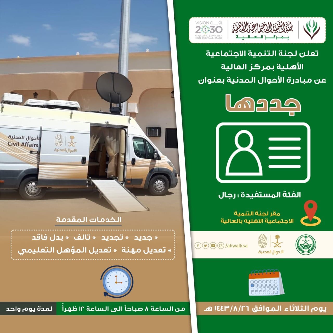 بحضور رئيس مركز العالية الاستاذ عيسى بن عبده العقيلي ورئيس التنمية الاجتماعية الأهلية بالعالية الاستاذ الحسين بهلول أطلقت لجنة التنمية الاجتماعية الأهلية بالعالية صباح اليوم الثلاثاء الموافق ٢٦ / ٨ / ١٤٤٣ مبادرة جددها بالتعاون مع الأحوال المدنية بجازان وذلك بمقر جمعية التنمية الاجتماعية الأهلية بالعالية التابعة لمركز العالية لمدة يوم واحد والتي استهدفت فئة الرجال لخدمة وتسهيل المواعيد والتي تسهم في اختصار الوقت وتقليل الجهد على المستفيدين ووفرت للمستفيدين خدمة الهوية الوطنية من تجديد وبدل تالف وبدل فاقد وتعديل مهنة وتعديل المؤهل التعليمي.