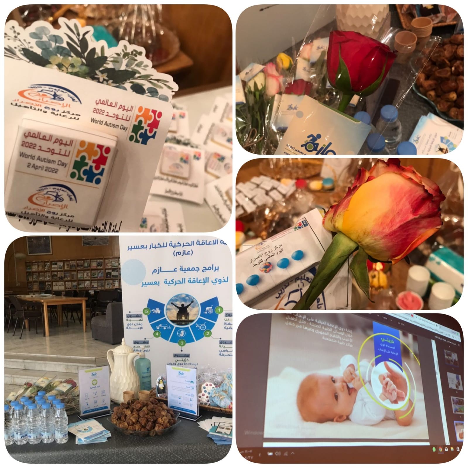 فعل مركز روح الإصرار اليوم العالمي للتوحد بالمكتبة العامة وبحضور ومشاركة من منسوبات جمعية عازم للإعاقة الحركية الأستاذة جيهان القحطاني والأستاذة رانية العسيري أخصائية نفسية ومشاركهة بركن تعريفي يشمل على عروض مرئية وفلم وثائقي مفصل وهدايا للأطفال ومنشورات تفصيلية عن المشاريع والبرامج التي تُقدمها جمعية الإعاقة الحركية للكبار بعسير "عازم".