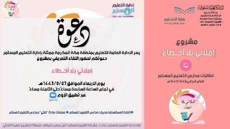 أقامت الإدارة العامة للتعليم بمنطقة مكة المكرمة، ممثلة بإدارة التعليم المستمر، اليوم الأربعاء الموافق 27/8/1443هـ اللقاء التعريفي بمشروع (إملائي بلا أخطاء)، عبر القاعة الافتراضية، بحضور مساعدة المدير العام للشؤون التعليمة الأستاذة/ لمياء بشاوري وبإشراف مديرة إدارة التعليم المستمر دلال اللحياني، ومسؤولة المشروع المشرفة التربوية أمل باعبد الله، ومنسقة المشروع منيرة الحارثي، استهدف فيه مديرات ومعلمات لغتي، وهذا المشروع يهدف الى: رفع مستوى الطالبات في الاملاء، وتنمية روح الإنتاجية والإبداع لدى الطالبات، وبث روح التنافس بين الطالبات، والتشجيع المستمر للطالبات، مع مراعاة قواعد الخط أثناء الكتابة، وتحديد الأخطاء الشائعة لعلاجها.