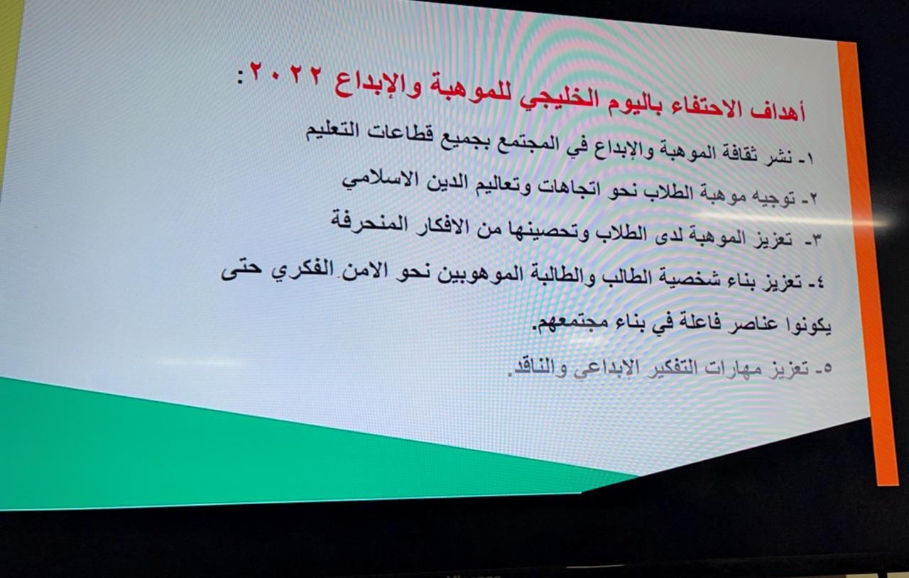 وذلك بهدف الاحتفاء باليوم الخليجي للموهبة والإبداع وذلك للاهتمام بالموهوبين والمبدعين، والتأكيد على نشر ثقافة الموهبة والإبداع في المجتمع بجميع قطاعات التعليم، كذلك توجيه موهبة الطالبات نحو اتجاهات وتعاليم الدين الإسلامي، مع تعزيز الموهبة لدى الطالبات وتحصينها من الأفكار المنحرفة، بالإضافة إلى تعزيز بناء شخصية الطالبة الموهوبة نحو الأمن الفكري حتى تكون عُنصراً فاعلاً في بناء المجتمع، بجانب تعزيز مهارات التفكير الإبداعي والناقد.