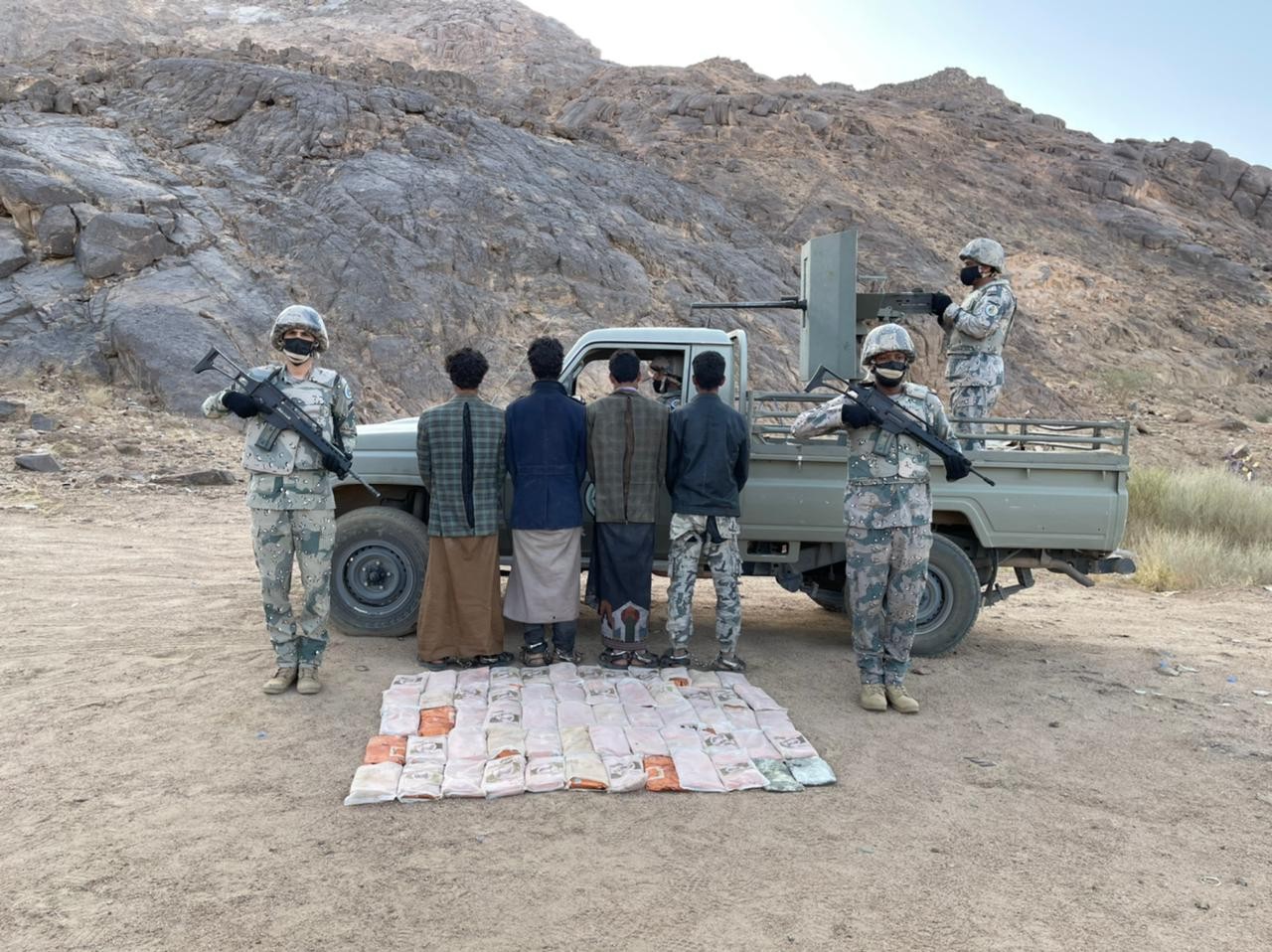 أحبطت الدوريات البرية لحرس الحدود في قطاع سقام بمنطقة نجران، محاولة تهريب (138) كيلو جرامًا من مادة الحشيش المخدِّر، وقبضت على مهربيها، (6) مخالفين لنظام أمن الحدود من الجنسية اليمنية، وجرى إيقافهم واتخاذ الإجراءات النظامية الأولية بحقهم، وتسليمهم والمضبوطات لجهة الاختصاص.