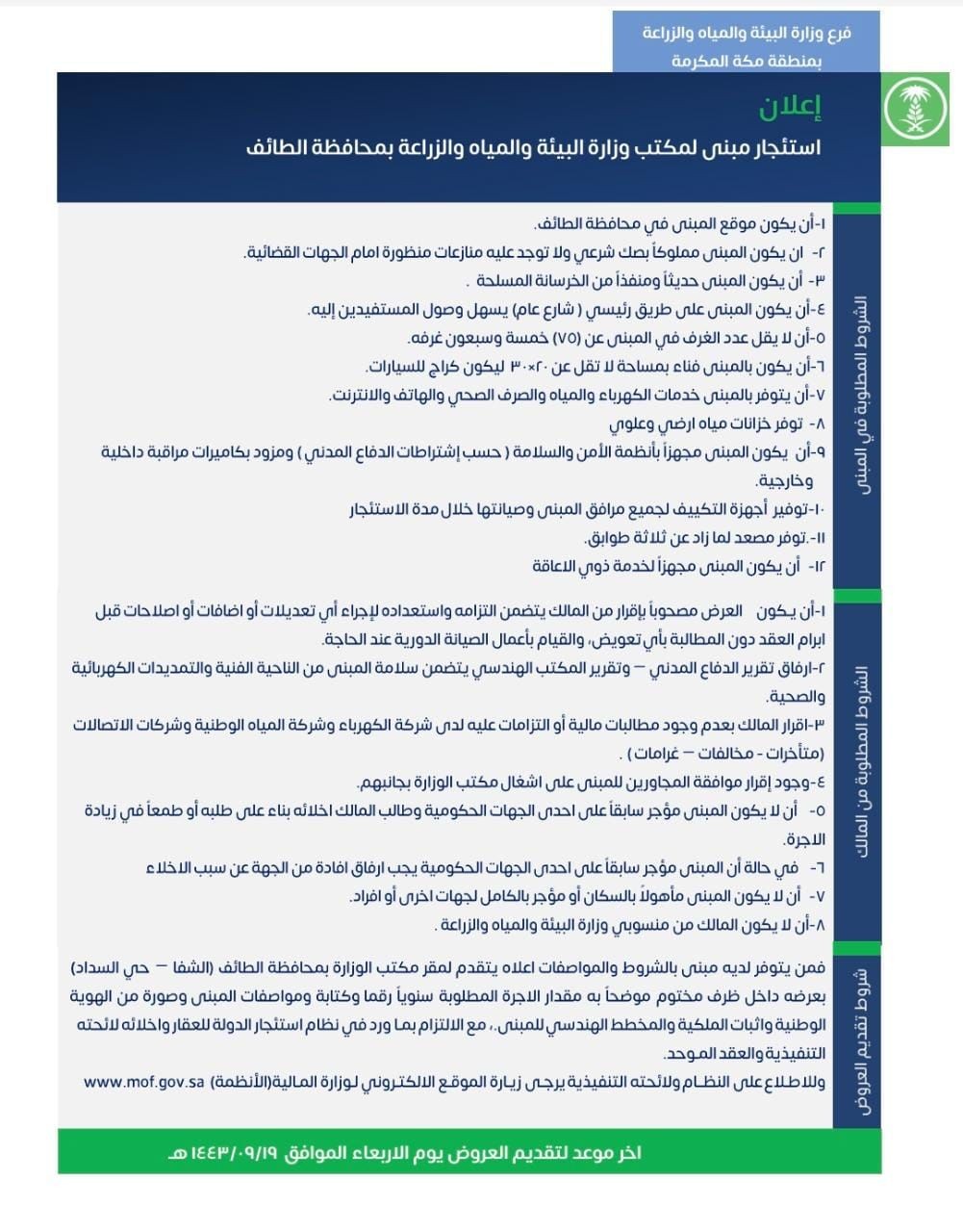ويمكن للراغبين التقدم لمقر مكتب وزارة البيئة والمياه والزراعة بمحافظة الطائف في ( طريق الشفا - حي السداد ) لدى قسم المالية،بعرض داخل ظرف مختوم موضحا به مقدار الأجرة المطلوبة سنويا رقما وكتابة ومواصفات المبنى وصورة من الهوية الوطنية واثبات الملكية والمخطط الهندسي للمبنى مع الالتزام بما ورد في نظام إستئجار الدولة للعقار وإخلائه ، مبيناً أن آخر موعد لتقديم العروض يوم الأربعاء الموافق 19 / 09 / 1443 هـ.