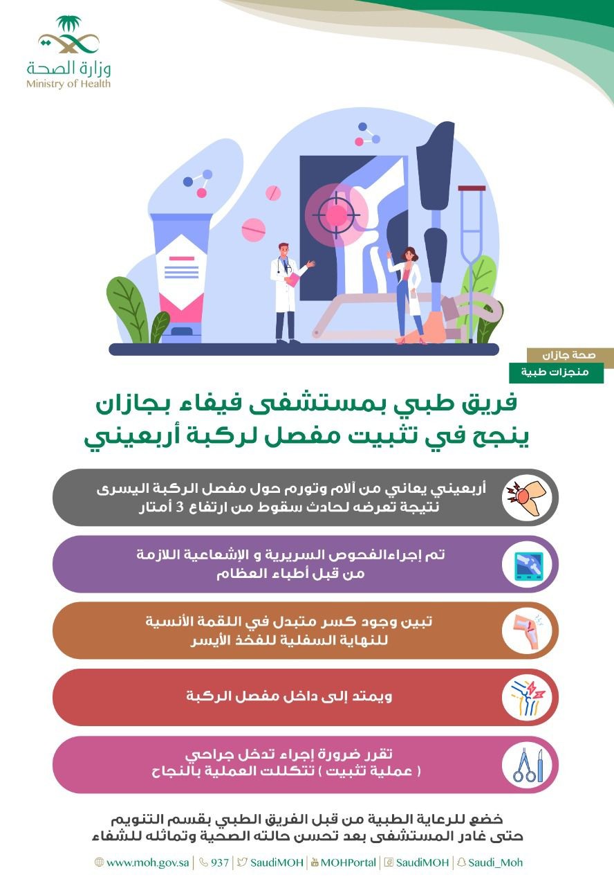 وأوضحت صحة جازان أن المريض حضر إلى قسم الطوارئ وكان يعاني من آلام وتورم حول مفصل الركبة اليسرى نتيجة تعرضه لحادث سقوط من ارتفاع 3 أمتار ، وبعد إجراء الفحوص السريرية والإشعاعية اللازمة من قبل أطباء العظام ، تبين وجود كسر متبدل في اللقمة الأنسية للنهاية السفلية للفخذ الأيسر ممتدًا إلى داخل مفصل الركبة ، وبعد اجتماع الفريق الطبي المعالج تقرر ضرورة إجراء تدخل جراحي ( عملية تثبيت ) تتكللت بالنجاح ولله الحمد .