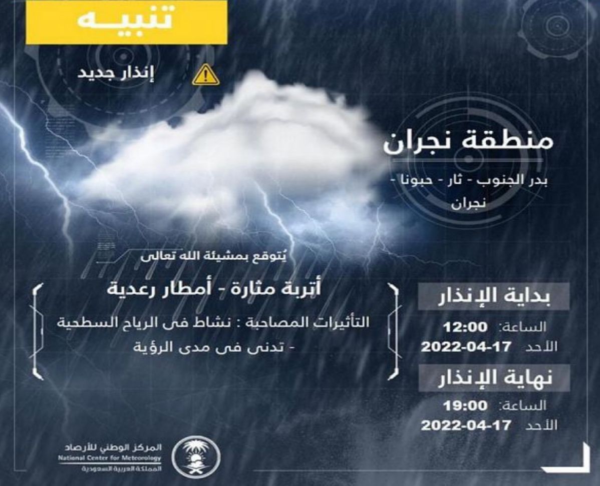 نبّه المركز الوطني للأرصاد اليوم من هطول أمطار رعدية على منطقة نجران، مصحوبة بأتربة مثارة ونشاط في الرياح السطحية، وتدنٍّ في مدى الرؤية،