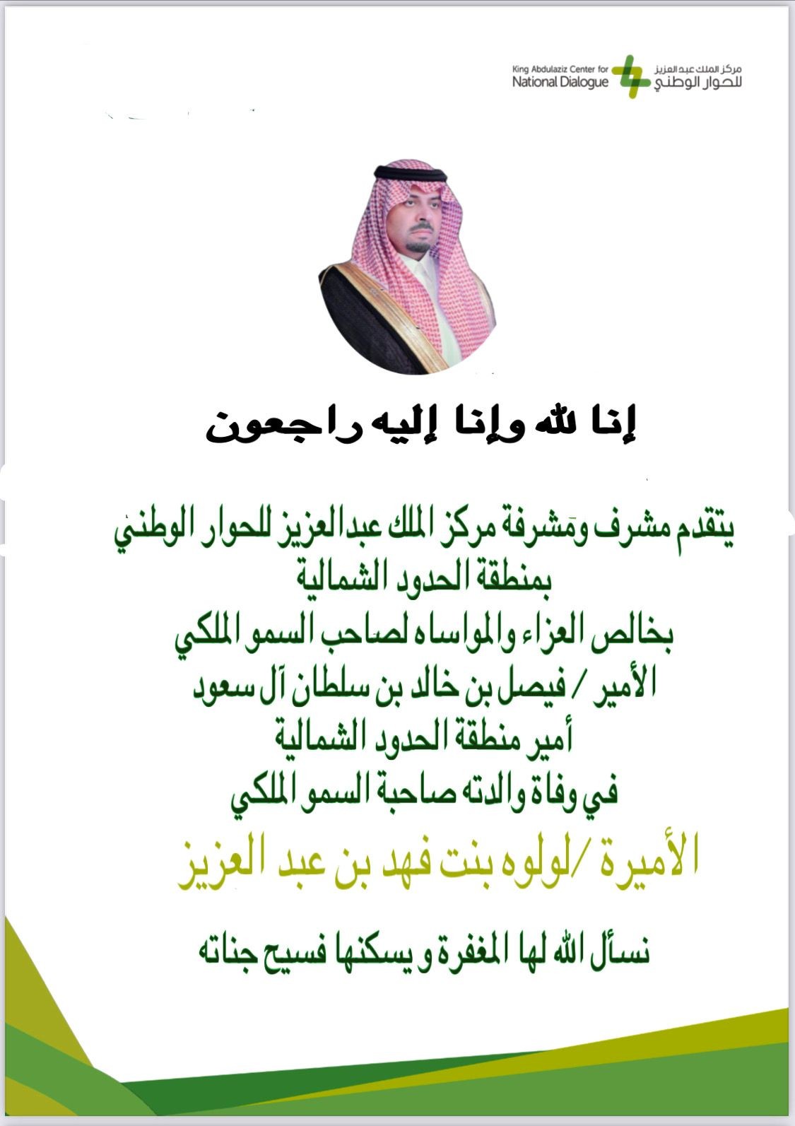 يتقدم مشرف ومشرفة  مركز الملك عبدالعزيز للحوار الوطني بمنطقة الحدود الشمالية  بمنطقة الحدود الشمالية بخالص العزاء والمواساه لصاحب السمو الملكي الأمير / فيصل بن خالد بن سلطان آل سعود أمير منطقة الحدود الشمالية في وفاة والدته صاحبة السمو الملكي الأميرة /لولوه بنت فهد بن عبد العزيز نسأل الله لها المغفرة و يسكنها فسيح جناته ونسأل الله ان يجبر المصاب وأن يتغمد الفقيدة بواسع رحمته ويسكنها فسيح جناته