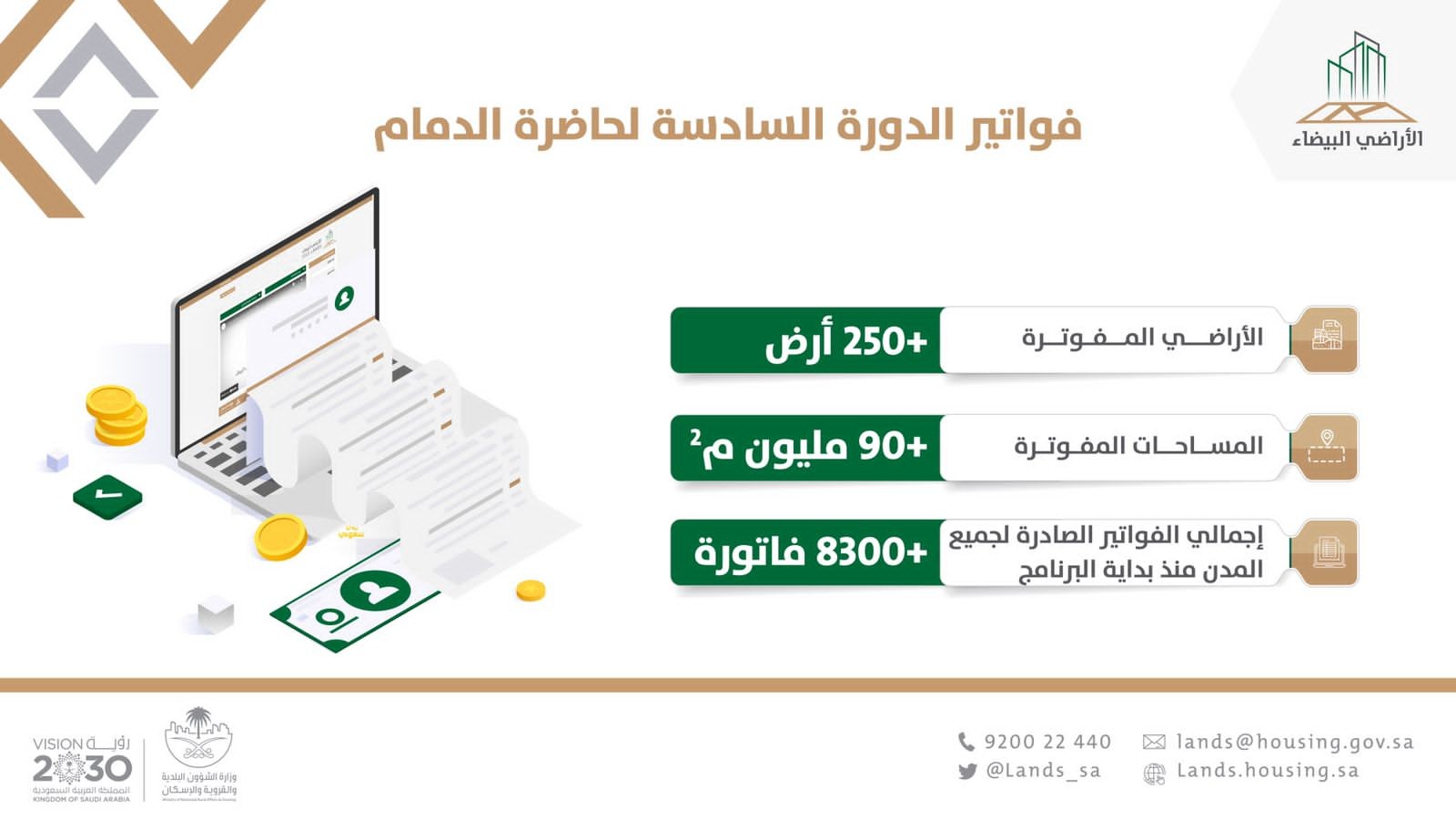 كشف برنامج "الأراضي البيضاء" أن فوترة الدورة السادسة للمرحلة الأولى في حاضرة الدمام صدرت على أكثر من 250 أرضًا واقعة داخل النطاق العمراني المعلن، بمجموع مساحات يتجاوز 90 مليون م2، مبيناً أن فواتير الدورة السادسة لرسوم الأراضي في حاضرة الدمام صدرت مارس الماضي، داعياً مُلاك الأراضي إلى المبادرة بتطوير أراضيهم أو السداد خلال سنة من تاريخ إصدار القرار.