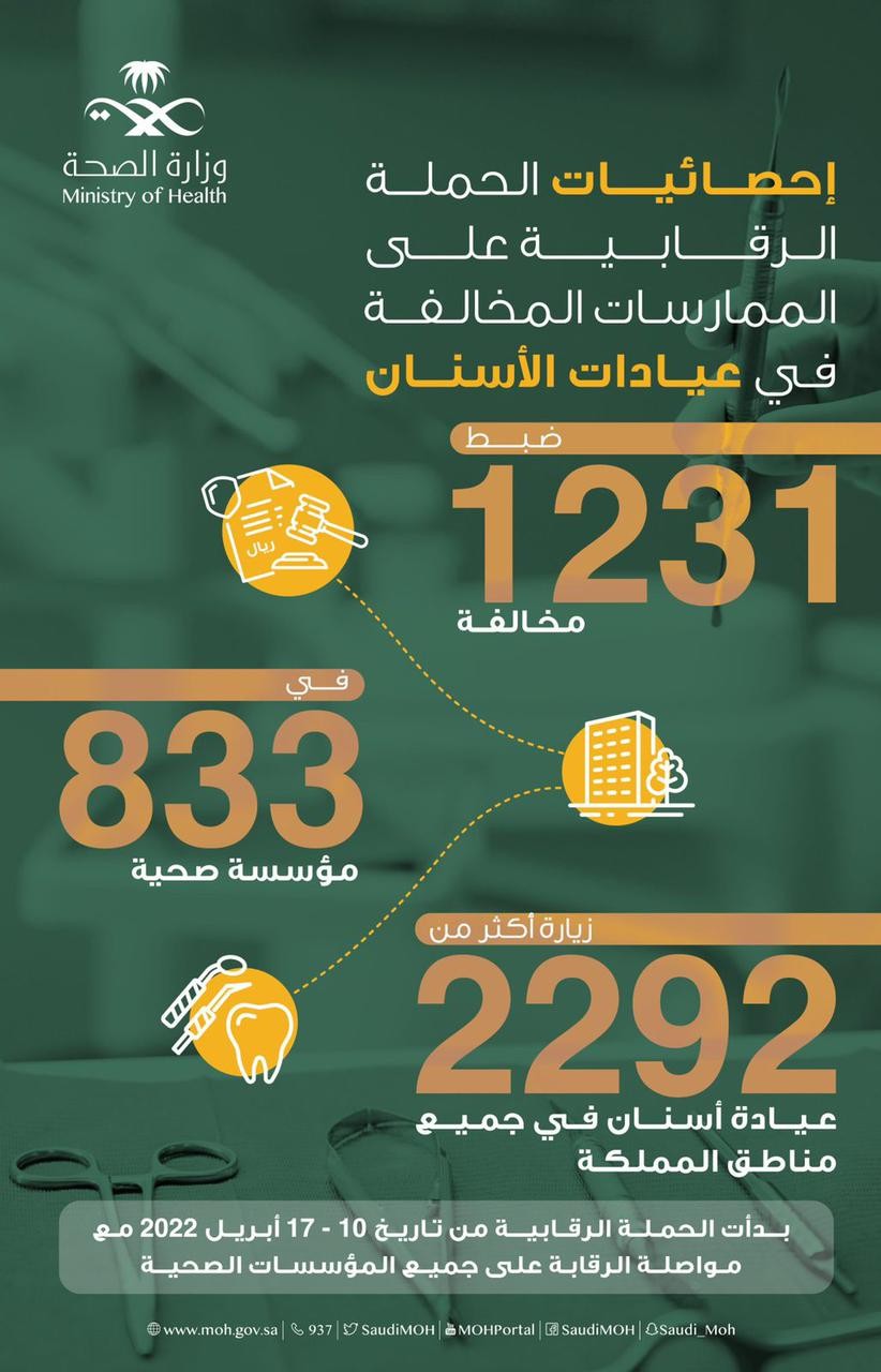 نفّذت فرق الالتزام في وزارة الصحة "2292" ألف زيارة رقابية ميدانية على عيادات الأسنان في جميع مناطق المملكة وذلك خلال الفترة من 10 حتى 17 ابريل للعام الحالي 2022 م حيث تم ضبط "1231" مخالفة في "833" مؤسسات صحية .