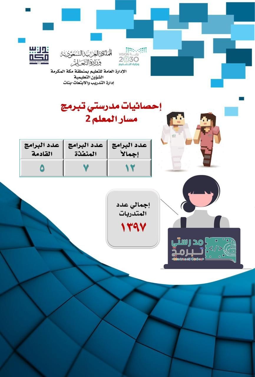 نفذت الإدارة العامة للتعليم بمنطقة مكة المكرمة ممثلةً بإدارة التدريب والابتعاث خلال الفترة من 5 /7/1443هـ إلى 18/10/1443هـ، الخطة التدريبية لبرنامج (مدرستي تبرمج-مسار المعلم2) والتي شملت 3 برامج للمعلمين حضرها 450 متدربًا بواقع 125ساعة تدريبية. كما أنهت إدارة التدريب للبنات 7 برامج من واقع 12 برنامجا وقد حضرها 1397 متدربة