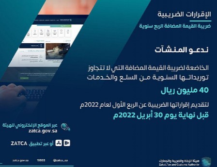 دعت هيئة الزكاة والضريبة والجمارك المكلفين من قطاع الأعمال الخاضعين لضريبة القيمة المضافة إلى تقديم إقراراتهم الضريبية عن شهر مارس الماضي والربع الأول من عام 2022م، وذلك في موعدٍ أقصاه 30 من شهر أبريل الجاري.
