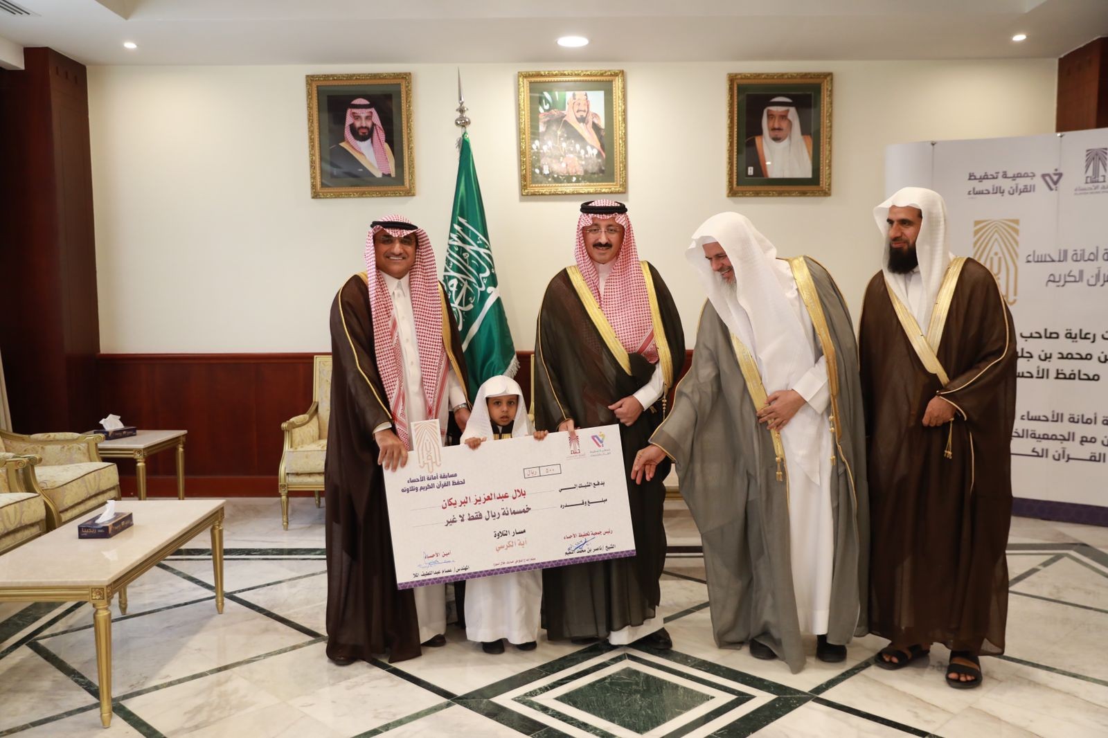 كرم صاحب السمو الأمير بدر بن محمد بن جلوي محافظ الاحساء ، الرئيس الفخري لمجلس إدارة الجمعية الخيرية لتحفيظ القران الكريم بالمحافظة ، اليوم  "الخميس" 20 رمضان ، الفائزين في مسابقة أمانة الاحساء بالتعاون مع الجمعيةلـ (حفظ القران الكريم وتلاوته ) ، والتي انطلقت في نهاية شهر شعبان حتى الـ 18 من رمضان ، بمشاركة 174 مشاركاً ، حيث هدفت المسابقة الى ( تشجيع المجتمع للإقبال على كتاب الله تعالى وربطهم بالقرآن الكريم ، تهيئة الحُفاظ المتقنين للمشاركة في المسابقات المحلية والدولية ،إبراز القدرات المتميزة ومكامن الإبداع لدى حفاظ القرآن الكريم).